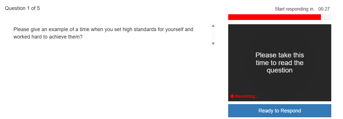 During a video response, the question will be displayed on the screen for a designated reading period. After this period ends, you are required to answer the question within the specified recording time.
