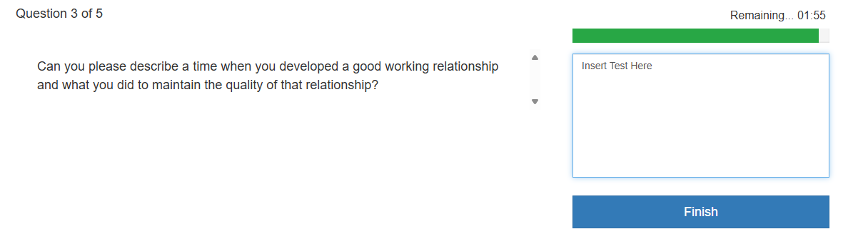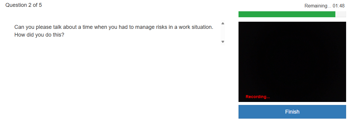 During your interview, you may be required to answer questions using various formats within specified timeframes. Common response methods include recording a video response, typing a written response, choosing from multiple-choice options, or in certain instances, uploading relevant documents.