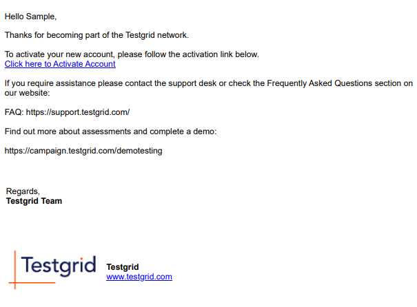 After creating your account, you’ll get an activation email from Testgrid within 10 minutes.